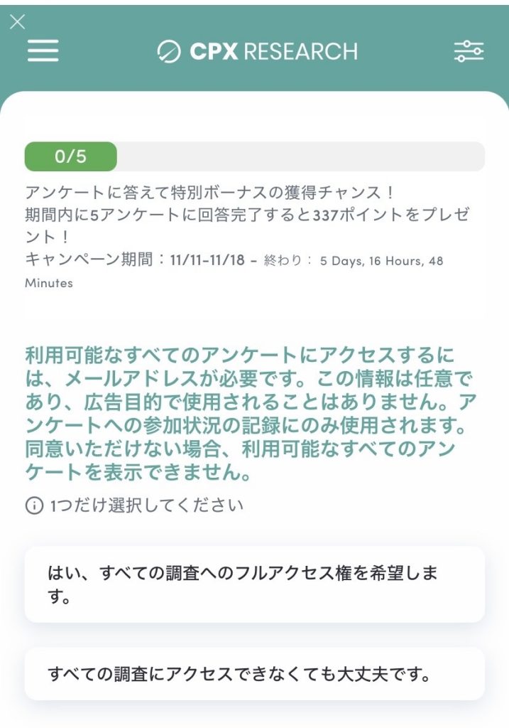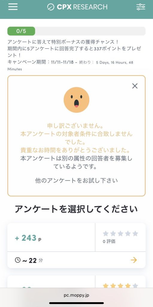 ちなみに挑戦しようとしましたが、情報入力したあと、オススメのアンケートはありません。て断られた🥲