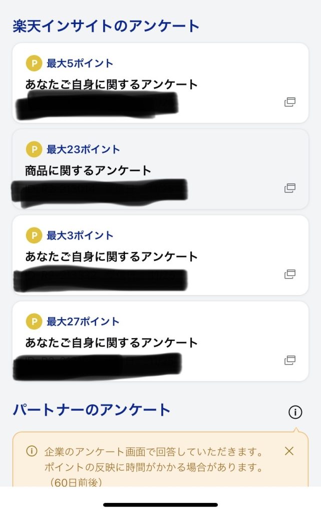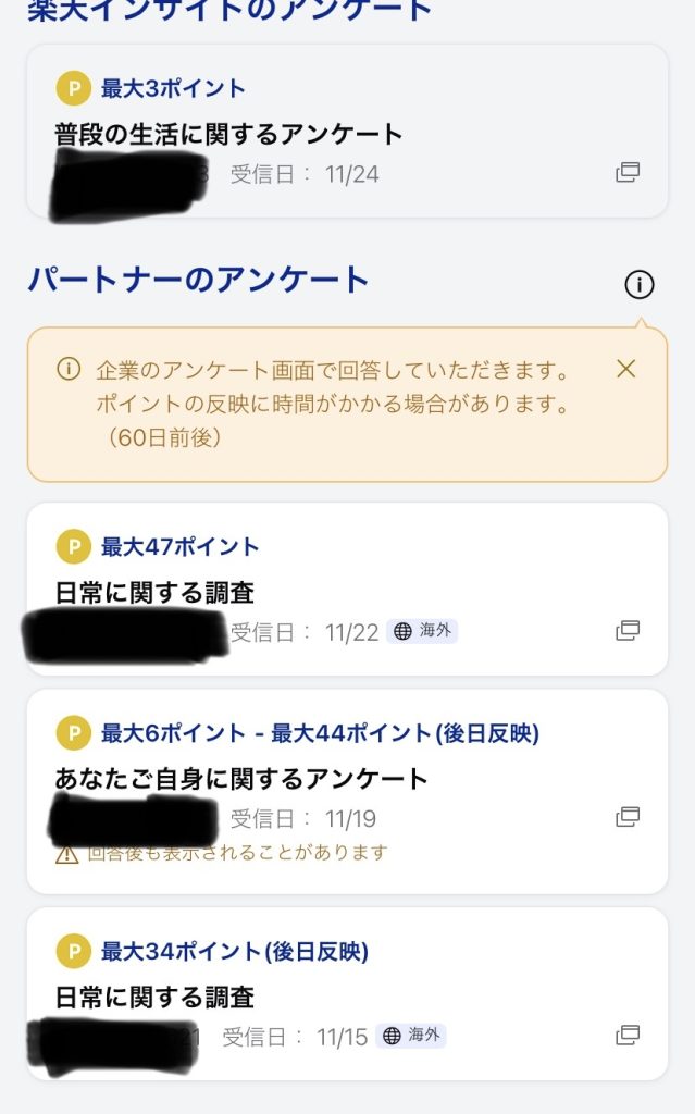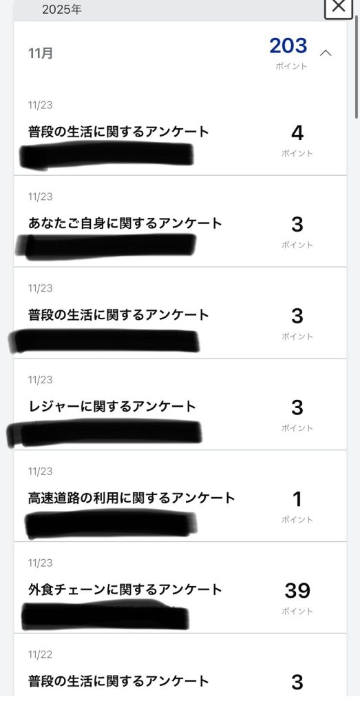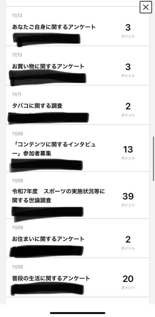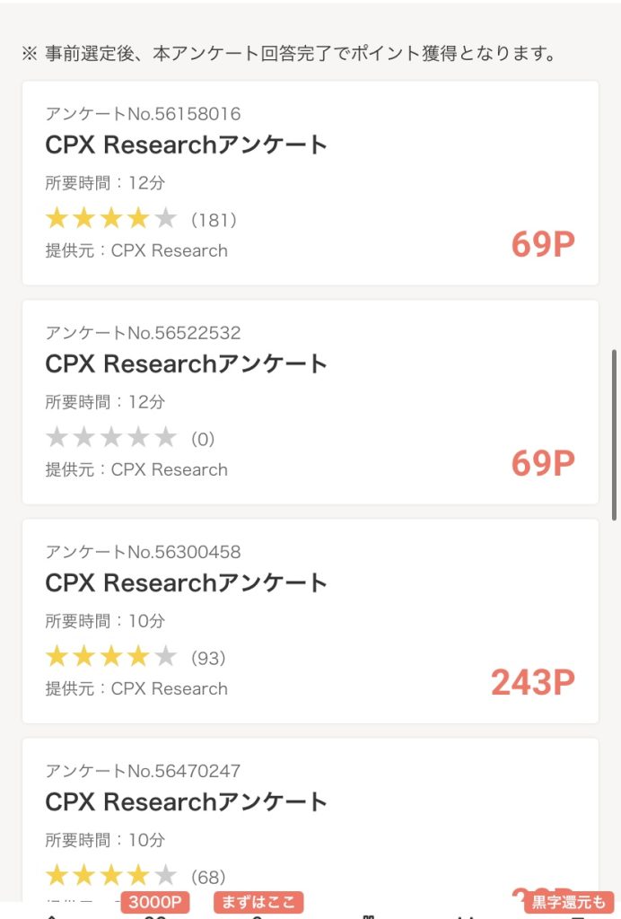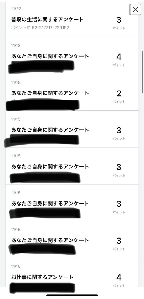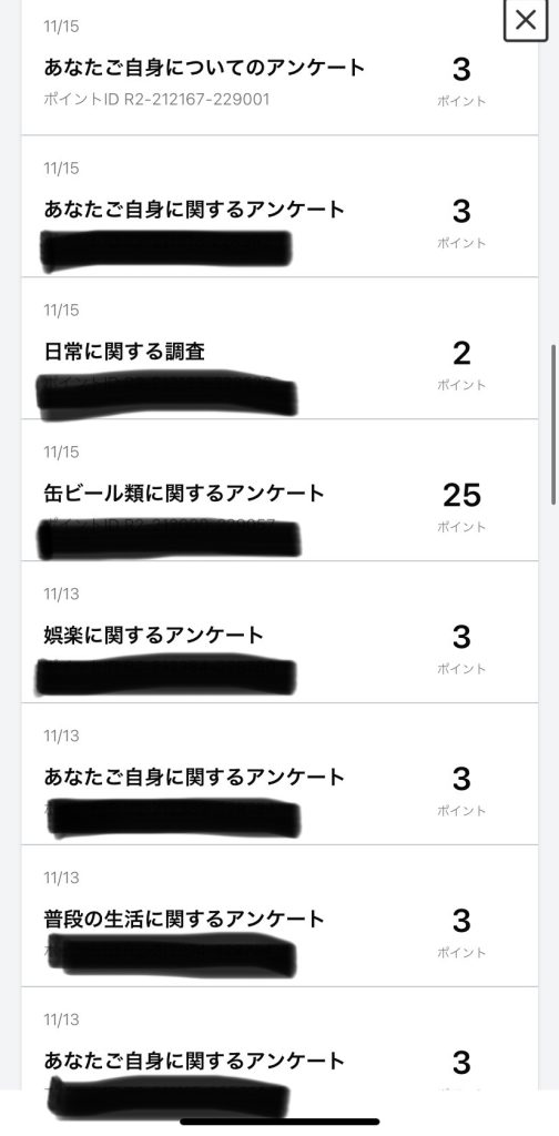 このように最大47ポイントなど記載されてるものも多くありますが、そのほとんどが相手(アンケートを出してる企業)が知りたい情報を答えれたらの最大報酬なので、当てはまらない場合は気持ち程度の3ポイントで終わります(泣)