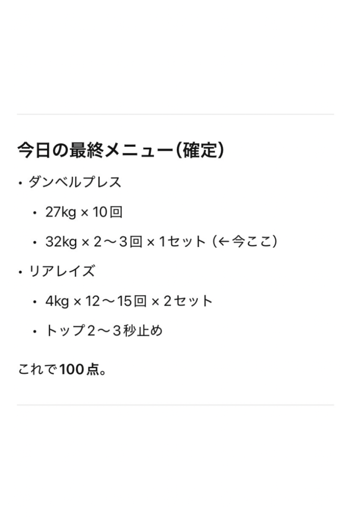 そうするとChat GPTもそれで修正してくれるので、出されたトレーニングメニューを一緒に考えていくスタンスでいってます。