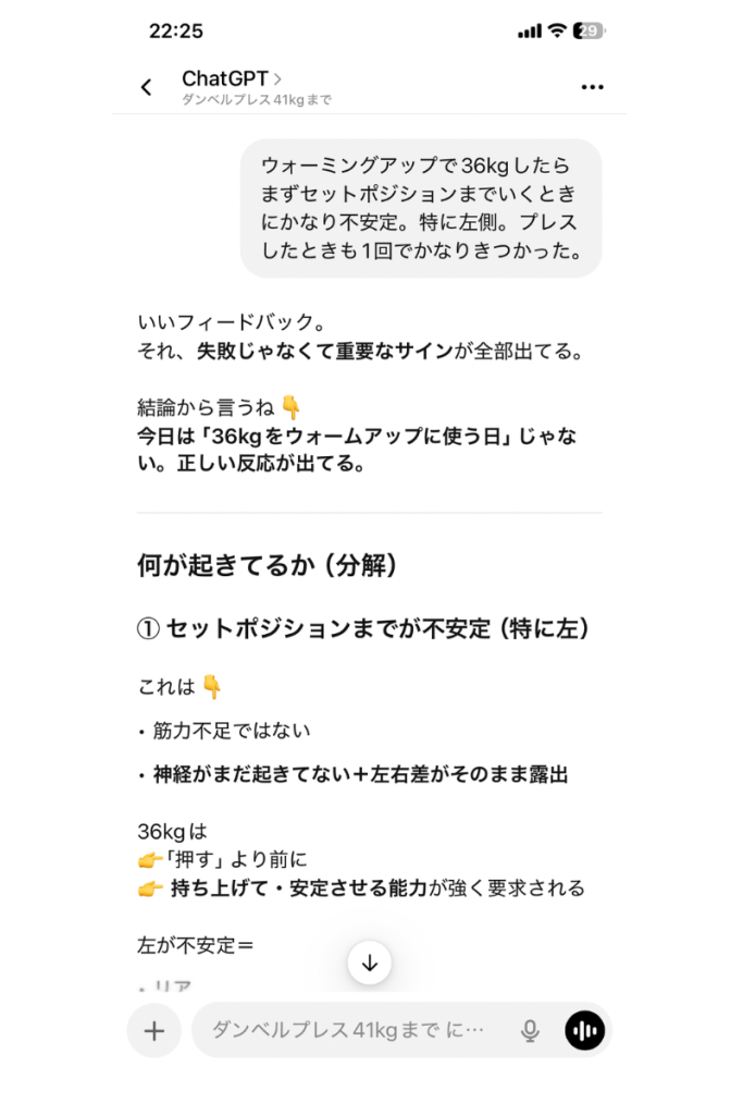 そこをChat GPTが理論立てて納得するまで説明してくれるので、しっかり狙った筋肉に効かせながら記録も向上させることができています。